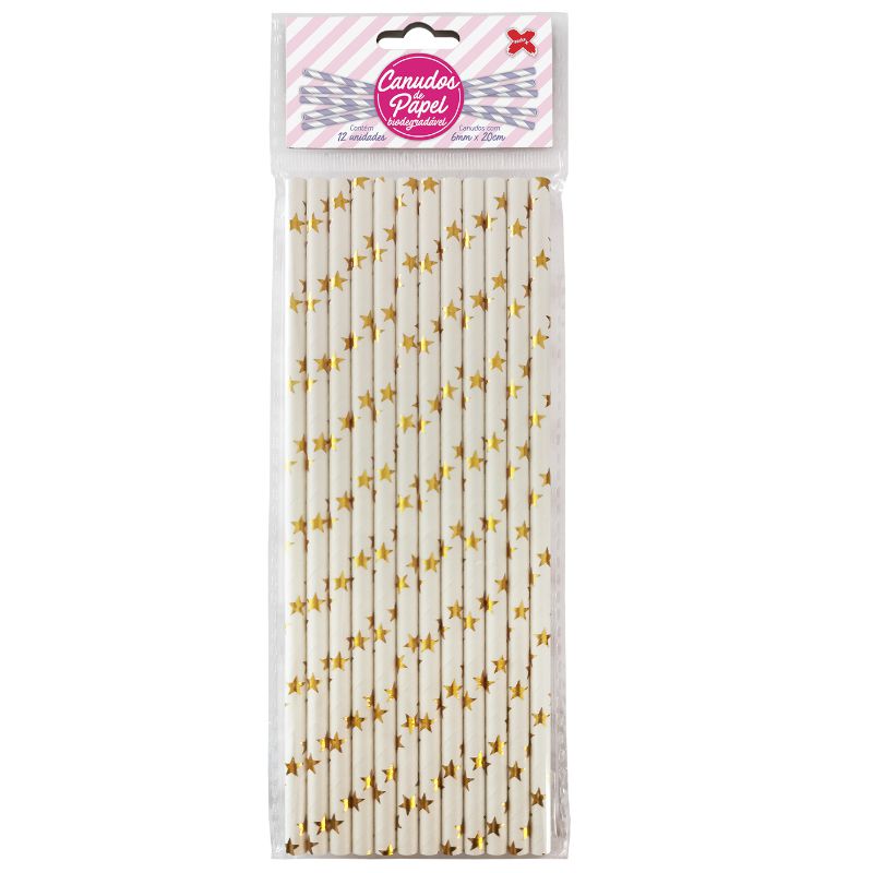 CANUDO DE PAPEL BRANCO E OURO METALICO ESTRELINHAS 6MMX200MM - COM 12 UNIDADES - MAKE MAIS