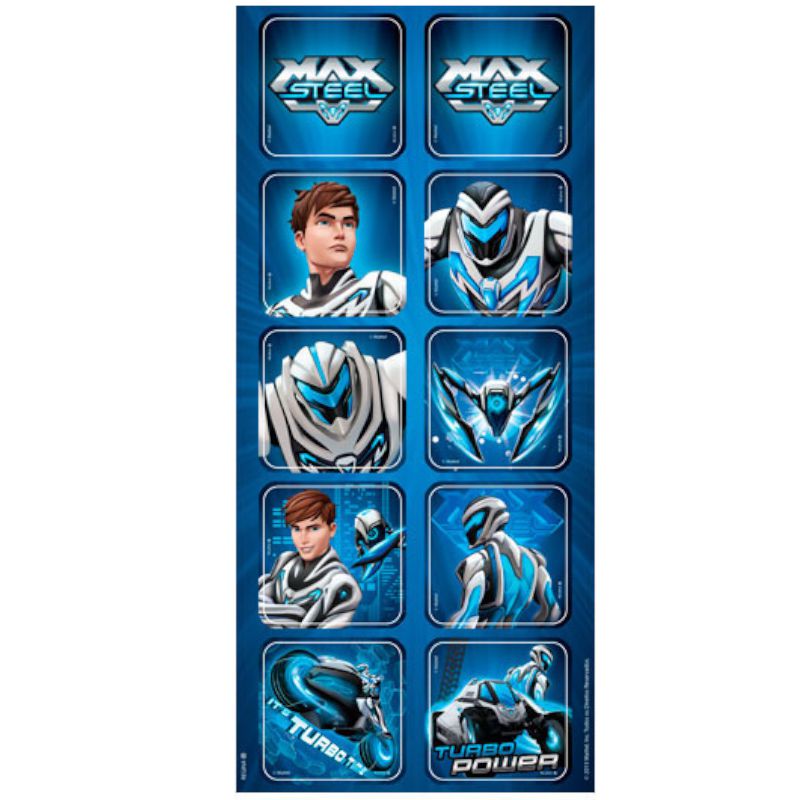Adesivos auto colantes com todos os personagens em cores vivas do tema MAX STEEL.