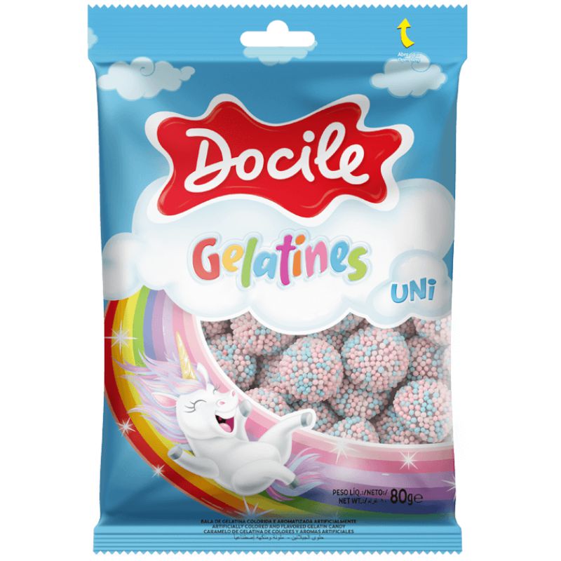 A linha Gelatines da Docile oferece balas coloridas, com formatos divertidos e exclusivos e é a opção mais saborosa do mercado. Possui diversos tipos de cobertura e sabores, que vão dos docinhos aos azedinhos. Oferecem um momento mágico ao paladar e uma nova descoberta para os sentidos com suas texturas que podem ser de açúcar ou com confeitos crocantes de miçangas.