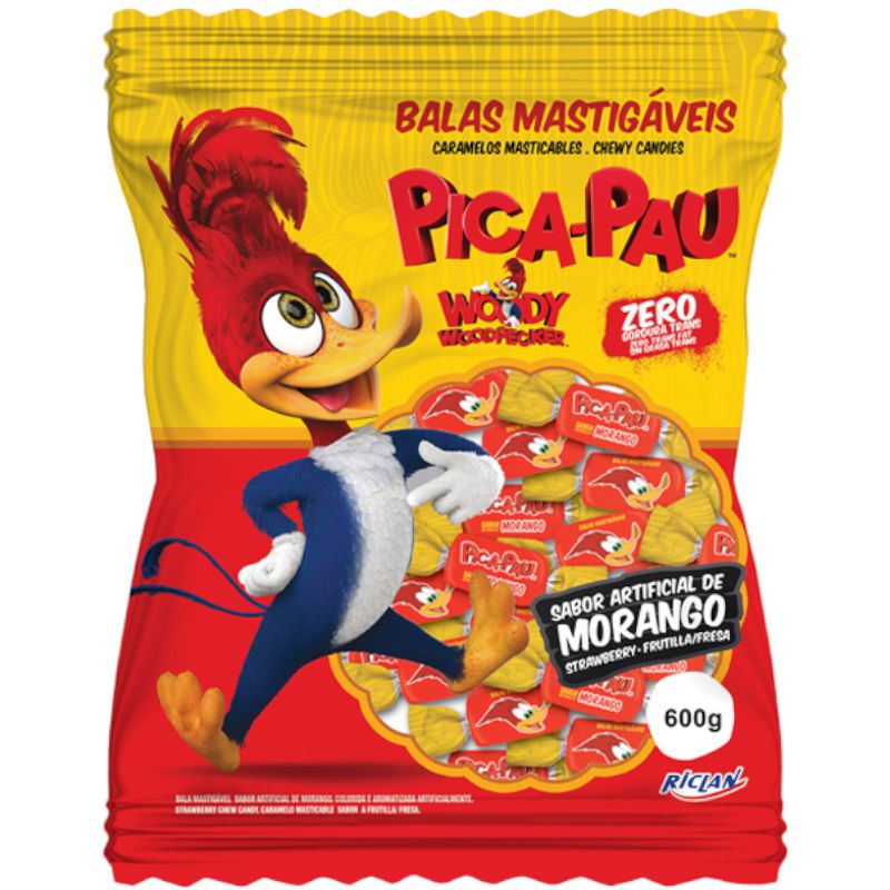 Bala mastigável do Pica-Pau no sabor morango. Ideal para comemorações de festas, lembrancinhas, comércio ou para adoçar o seu dia! Embalagem de 600g contendo aproximadamente 100 unidades.