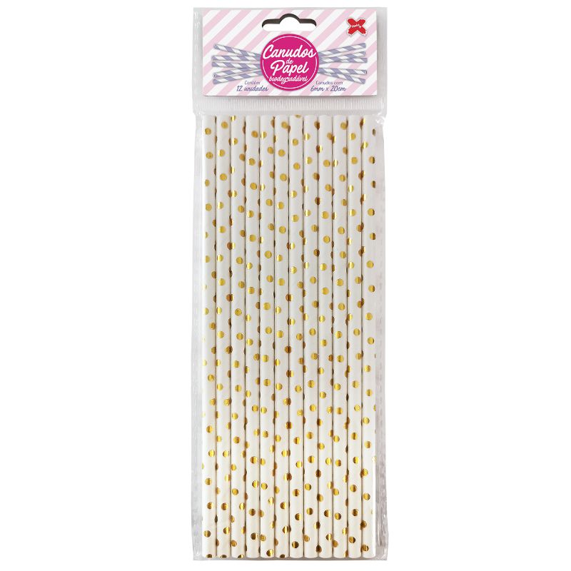 CANUDO DE PAPEL BRANCO E OURO BOLINHAS 6MMX200MM - 12 UNIDADES - MAKE MAIS - LOJA DO ABENÇOADO