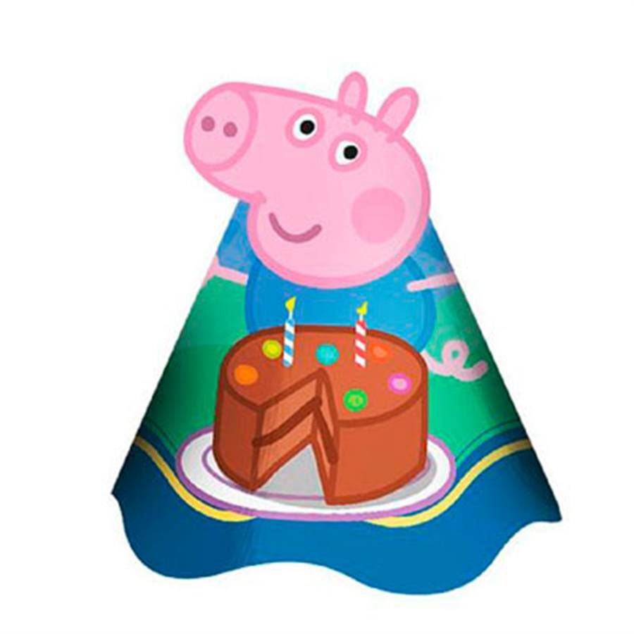 Divirta os convidados e complemente sua festa infantil temática com esses chapeuzinhos de aniversário com ilustrações do George Pig. George Pig é o irmão mais novo da Porquinha Peppa Pig e o menor integrante da Família Pig. George Pig adora brincar com sua irmã Peppa e seus amigos, além de ser um super fã de dinossauros e andar para toda parte com seu dinossauro de pelúcia o Sr. Dinossauro. Como ainda é muito novo George é um pouco chorão, mas a cada episódio aprende uma coisa nova.