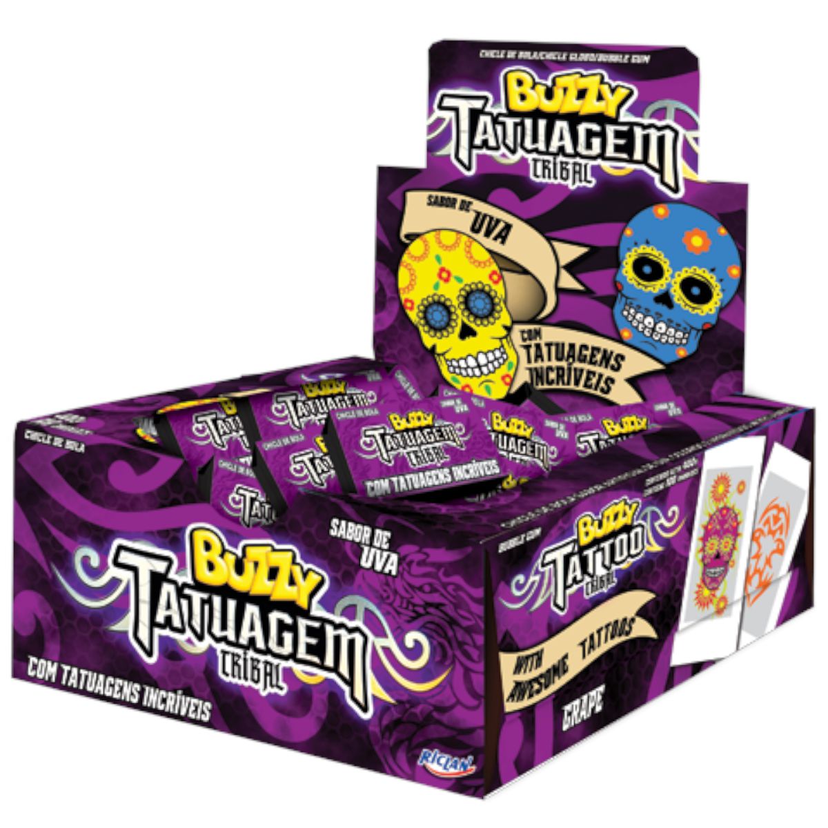 Chicle Buzzy no sabor morango com tatuagens iradas para você colecionar. Embalagem contendo 100 unidades.