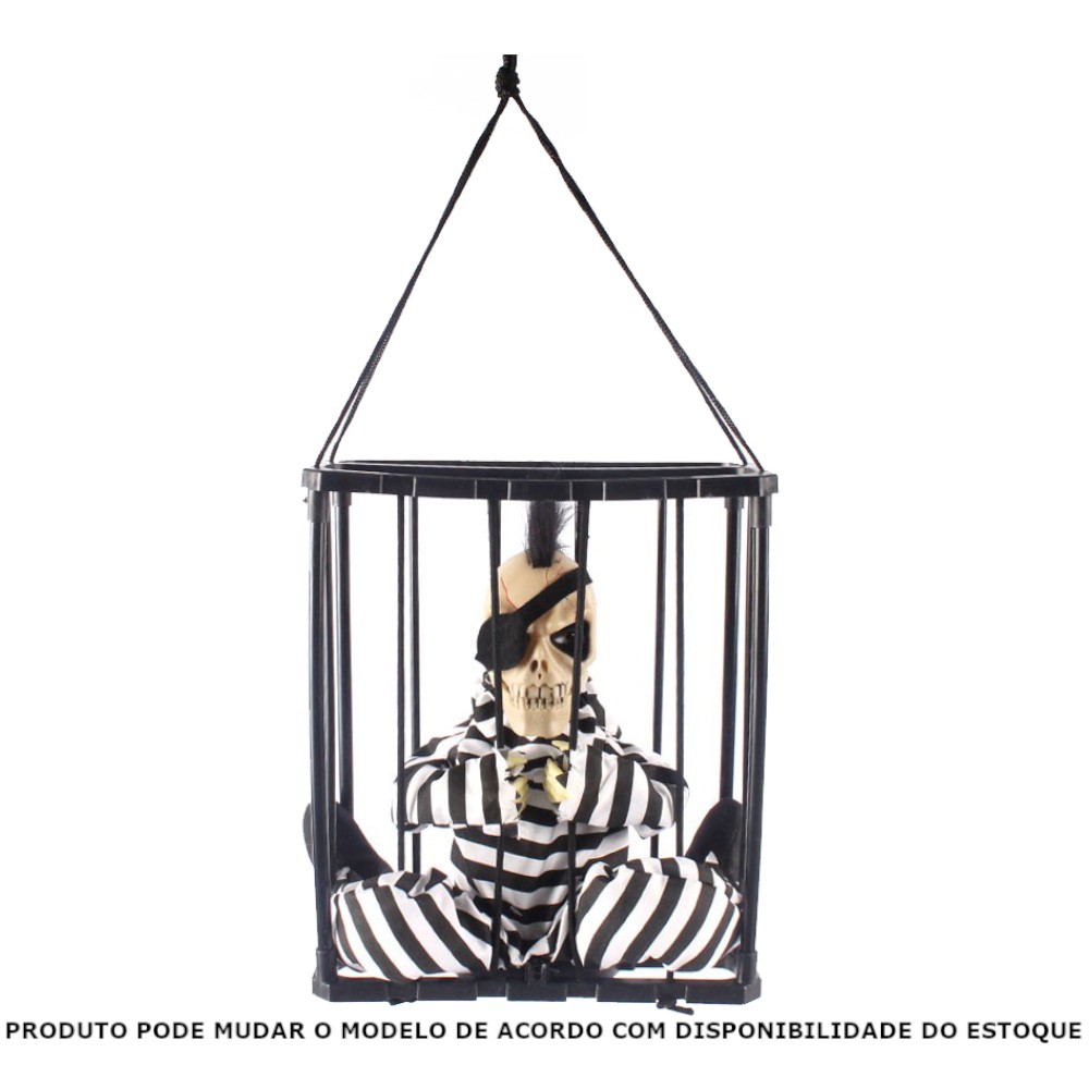 O Boneco Esqueleto Prisioneiro traz com muita excelência e criatividade combinada em materiais de altíssima qualidade o produto interativo perfeito para o Dia das Bruxas. Disponível em dois modelos, sendo um com o uniforme completo de presidiário e outro com tapa-olho e moicano, o boneco possui diversas funcionalidades eletrônicas: o movimento é baseado na tentativa do esqueleto em sair da jaula, puxando as "grades" e inclinando o corpo pra fora; os olhos emitem luzes vermelhas que o deixam ainda mais chamativo; o som emitido é baseado em frases em inglês onde o esqueleto tenta convencer o convidado a tirá-lo da jaula; possui sensor de aproximação que garante muitos sustos na proximidade!