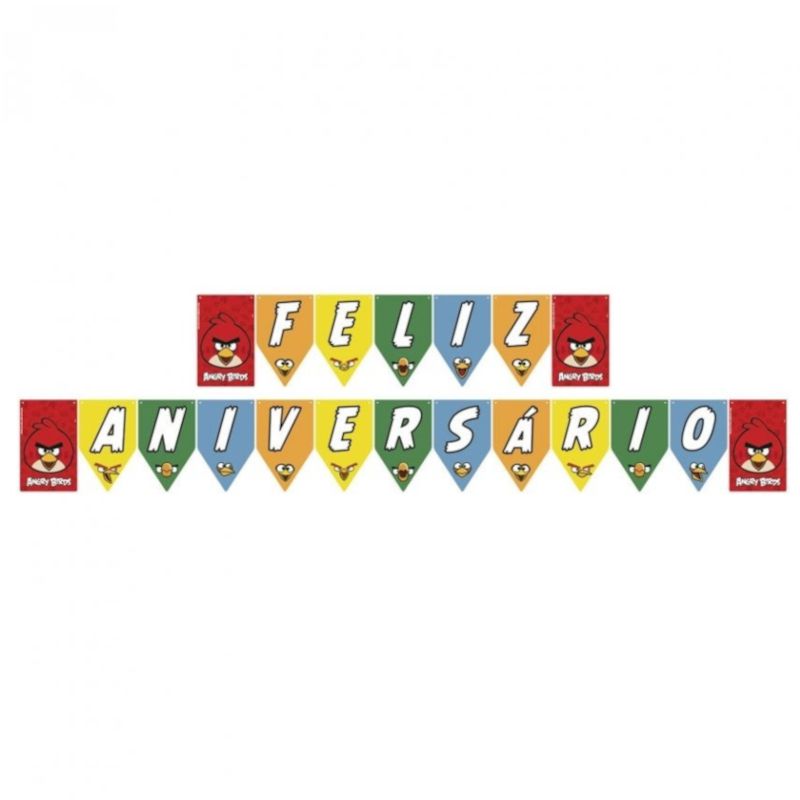 Faixa com a frase "Feliz Aniversário" com os personagens e as cores do tema do divertido jogo Angry Birds.