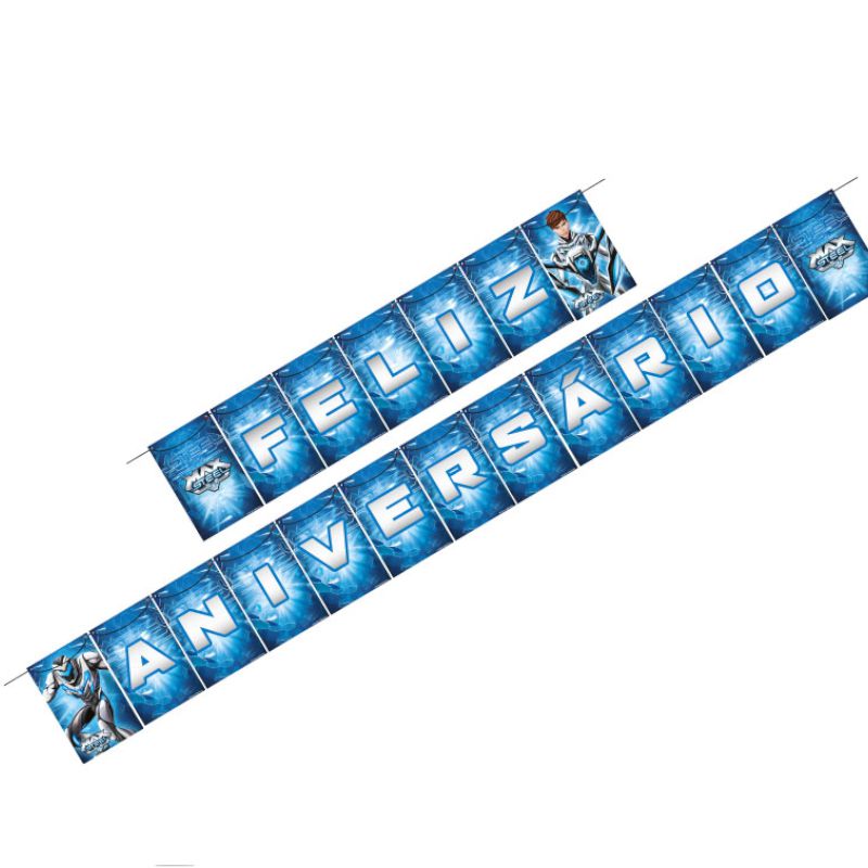 FAIXA FELIZ ANIVERSARIO FESTA MAX STEEL - 01 FAIXA 2,5M X 20CM (20 UNIDADES) + 01 FITA DE CETIM 4M X 6MM - REGINA FESTAS - LOJA DO ABENÇOADO