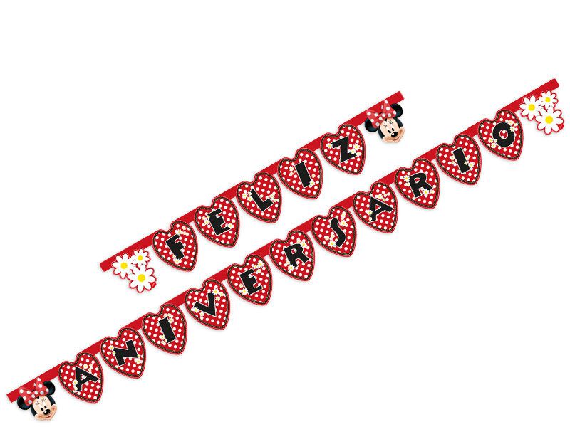 Faixa com a frase "Feliz Aniversário" com ilustrada com o tema Minnie Vermelha.
