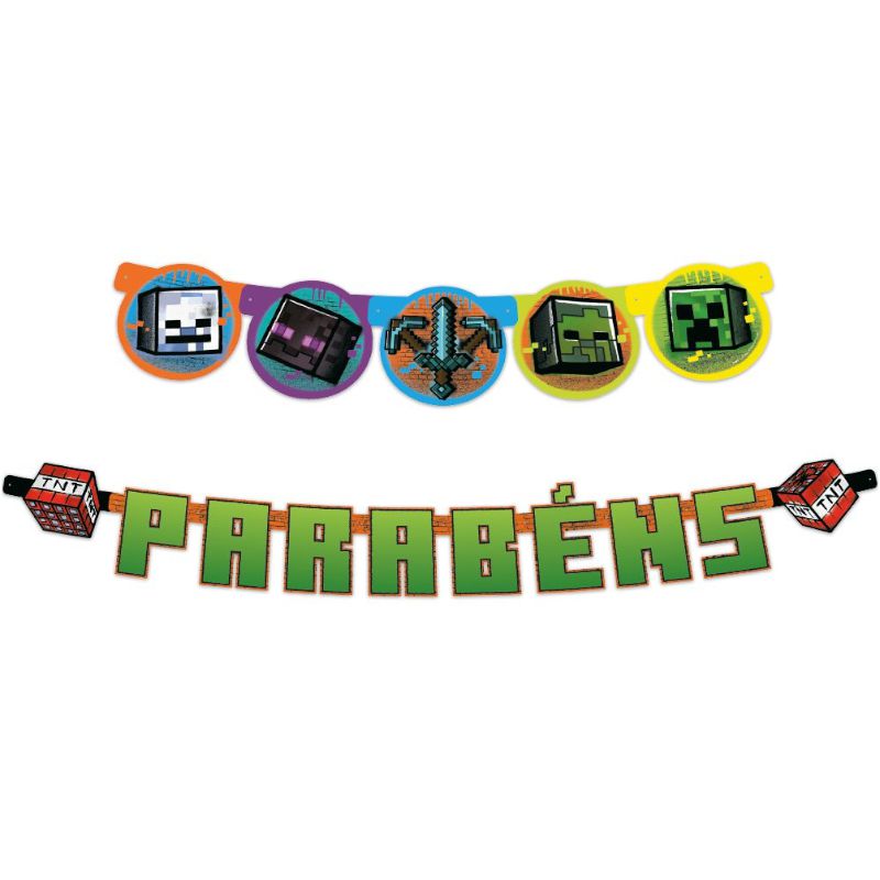 A Faixa Parabéns Festa Minecraft Grafite Regina é ideal para pendurar ao fundo da mesa do bolo criando uma linda decoração.