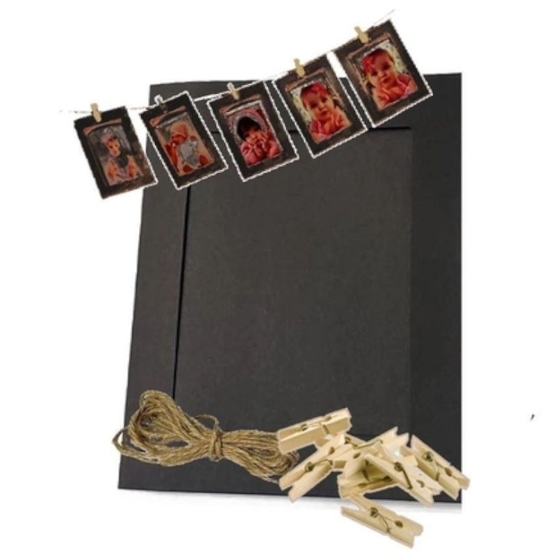 Acompanha: cordão de juta, 10 mini pregadores coloridos e 10 molduras na cor Preto para as fotos.