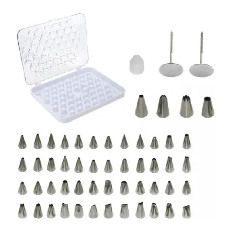 Conjunto profissional com peças, sendo: 52 Bocais Tubos de decoração de Metal - 01 acoplador - 02 suportes de flores (Bailarinas) - 01 Estojo de armazenamento de plástico