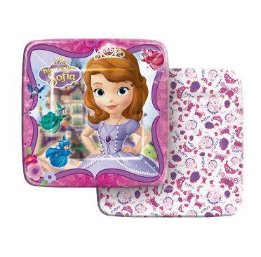 Prato em papel cartão descartável em formato quadrado, ilustrado com o lindo tema Princesinha Sofia.