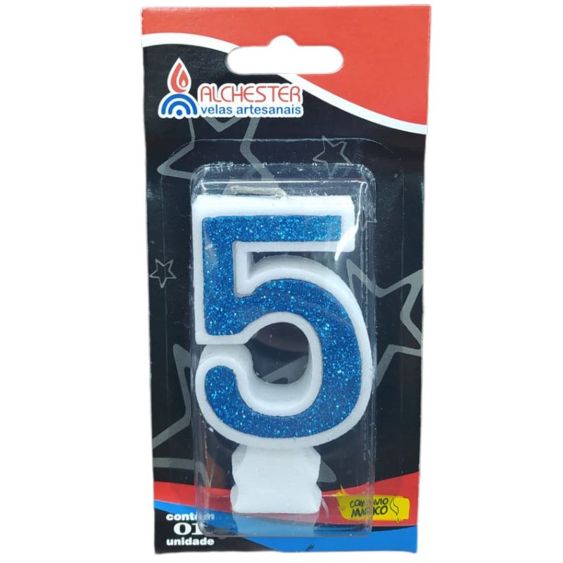 VELA DE ANIVERSÁRIO GLITTER AZUL - N° 5 - 01 UNIDADE - ALCHESTER - LOJA DO ABENÇOADO