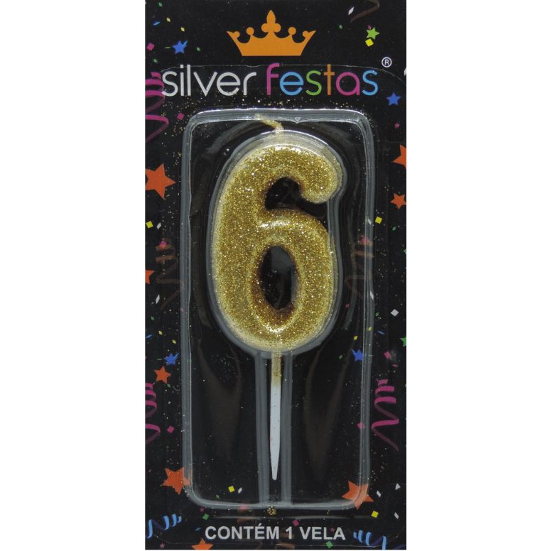 VELA GLITTER DOURADA - NÚMERO 6 - SILVER FESTAS - LOJA DO ABENÇOADO