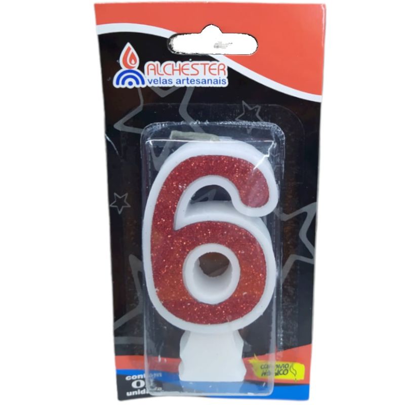 VELA DE ANIVERSÁRIO GLITTER VERMELHO - N° 6 - 01 UNIDADE - ALCHESTER - LOJA DO ABENÇOADO