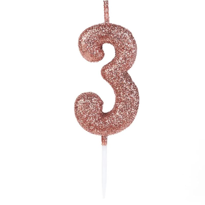 VELA DE ANIVERSÁRIO ROSE GOLD GLITTER PEQUENA - NÚMERO 3 - 01 UNIDADE - SILVER FESTAS - LOJA DO ABENÇOADO