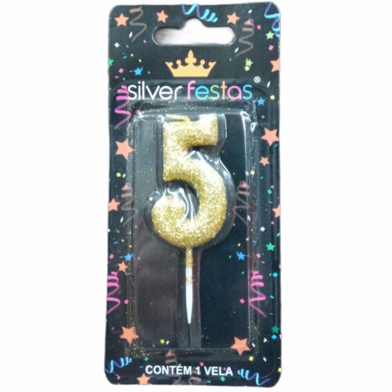 VELA GLITTER DOURADA - NÚMERO 5 - SILVER FESTAS - LOJA DO ABENÇOADO